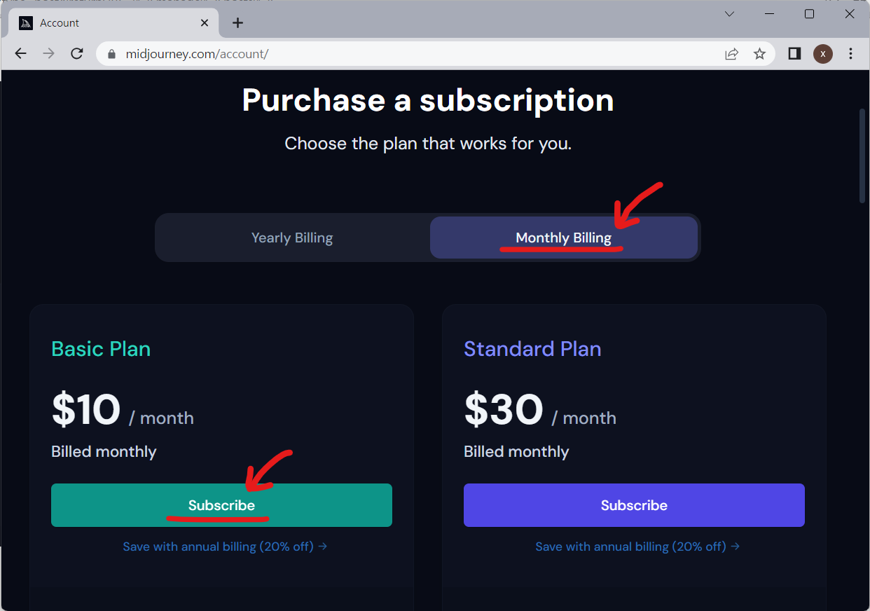 3. 기본으로 연간 결제 [Yearly Billing]이 선택되어 있습니다. 이렇게 결제하면 최종 결제화면에서 총 $96 를 결제해야 합니다. 처음부터 이것은 좀 과한 것 같고, 효과적으로 사용하기 위해서는 [Monthly Billing]을 선택 하고 [Basic Plan]으로 사용해보세요. 이렇게 하면 $10 만 결제하면 됩니다. 조금 많이 사용한다 하면 [Standard Plan]으로 업그레이드 합니다.