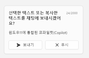 코파일럿을 호출 후 평소 Bing Chat을 사용하듯 이것 저것 물어보며 요구하면 됩니다. 텍스트를 드래그 후 복사하기 단축키 [Ctrl]+[C]키를 누르면 코파일럿이 무언가 하려고 합니다. 스크린캡처를 해도 동일합니다. 일단 클립보드로 복사하면 뭔가 의도가 있다고 간주한 것 같습니다. 이게 이벤트 트리거로 동작하니 살짝 번거롭기도 합니다.